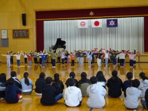 本日、卒業を祝う会を行いました。どの学年も日頃なかなか伝えることができない”感謝”の思いを、メッセージや歌などの出し物に込めて6年生に伝えました。また教職員からも6年生へ歌を贈りました。6年生からは「翼をください」の合唱のお返しがありました。最後の送り出しでは、6年生の姿は清々しく互いの思いがしっかりと伝わった様子でした。