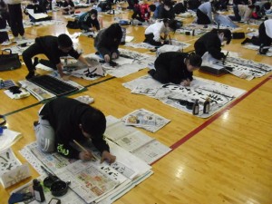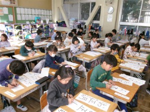 書きぞめ制作会 2026年1月15日 最終更新日時 : 2026年1月15日 kumagaya_edit 本日、書きぞめ制作会を行いました。1・2年生は教室で画用紙にサインペンを使って、3~6年生は体育館で画仙紙に毛筆で書きました。教室も体育館も開始から落ち着いた雰囲気で、お手本を見ながら集中して取り組んでいる様子でした。